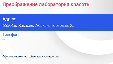 Преображение, лаборатория красоты по адресу 655016, Хакасия, Абакан, Торговая, 2а в дальнейшем Организация, размещена в следующих категориях: