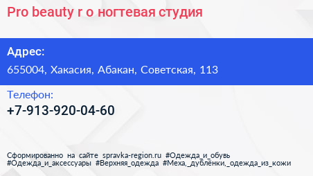Pro beauty r.o, ногтевая студия по адресу 655004, Хакасия, Абакан, Советская, 113 в дальнейшем Организация, размещена в следующих категориях: