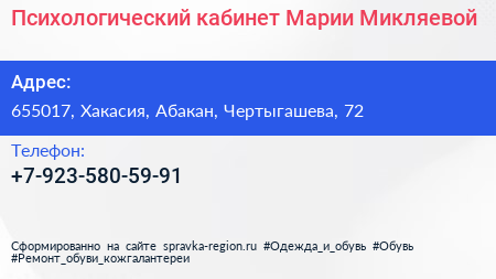 Психологический кабинет Марии Микляевой по адресу 655017, Хакасия, Абакан, Чертыгашева, 72 в дальнейшем Организация, размещена в следующих категориях: