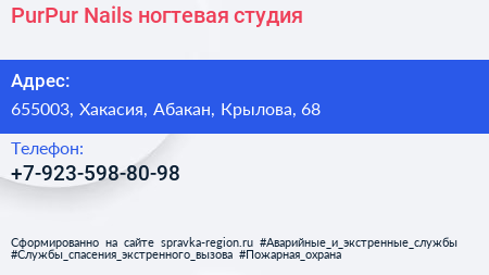 PurPur Nails, ногтевая студия по адресу 655003, Хакасия, Абакан, Крылова, 68 в дальнейшем Организация, размещена в следующих категориях: