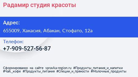 Радамир, студия красоты по адресу 655009, Хакасия, Абакан, Стофато, 12а в дальнейшем Организация, размещена в следующих категориях: