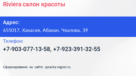 Riviera, салон красоты по адресу 655017, Хакасия, Абакан, Чкалова, 39 в дальнейшем Организация, размещена в следующих категориях: