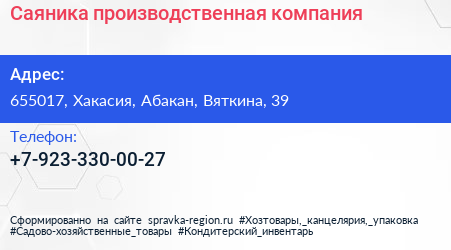 Саяника, производственная компания по адресу 655017, Хакасия, Абакан, Вяткина, 39 в дальнейшем Организация, размещена в следующих категориях: