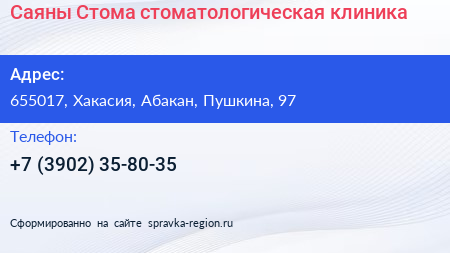 Саяны-Стома, стоматологическая клиника по адресу 655017, Хакасия, Абакан, Пушкина, 97 в дальнейшем Организация, размещена в следующих категориях: