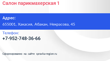 Салон-парикмахерская №1 по адресу 655001, Хакасия, Абакан, Некрасова, 45 в дальнейшем Организация, размещена в следующих категориях: