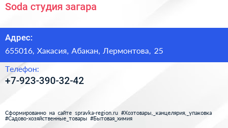 Soda, студия загара по адресу 655016, Хакасия, Абакан, Лермонтова, 25 в дальнейшем Организация, размещена в следующих категориях: