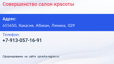 Совершенство, салон красоты по адресу 655650, Хакасия, Абакан, Ленина, 029 в дальнейшем Организация, размещена в следующих категориях: