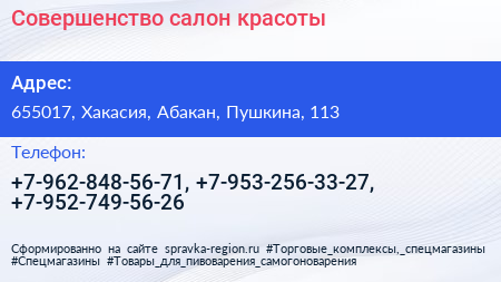 Совершенство, салон красоты по адресу 655017, Хакасия, Абакан, Пушкина, 113 в дальнейшем Организация, размещена в следующих категориях: