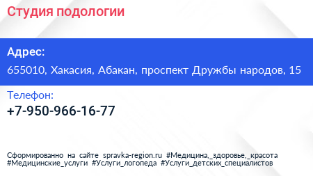 Студия подологии по адресу 655010, Хакасия, Абакан, проспект Дружбы народов, 15 в дальнейшем Организация, размещена в следующих категориях: