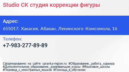Studio CK, студия коррекции фигуры по адресу 655017, Хакасия, Абакан, Ленинского Комсомола, 16 в дальнейшем Организация, размещена в следующих категориях: