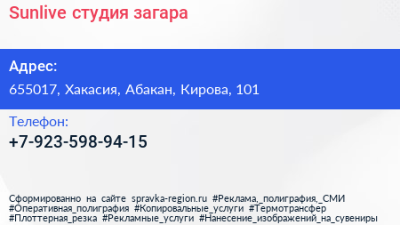 Sunlive, студия загара по адресу 655017, Хакасия, Абакан, Кирова, 101 в дальнейшем Организация, размещена в следующих категориях:
