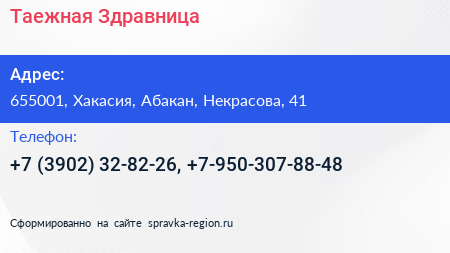 Таежная Здравница по адресу 655001, Хакасия, Абакан, Некрасова, 41 в дальнейшем Организация, размещена в следующих категориях: