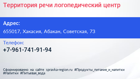 Территория речи, логопедический центр по адресу 655017, Хакасия, Абакан, Советская, 73 в дальнейшем Организация, размещена в следующих категориях: