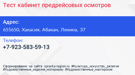 Тест, кабинет предрейсовых осмотров по адресу 655650, Хакасия, Абакан, Ленина, 37 в дальнейшем Организация, размещена в следующих категориях: