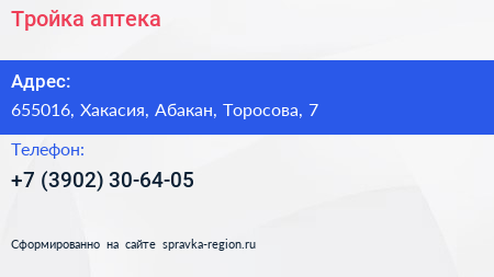 Тройка, аптека по адресу 655016, Хакасия, Абакан, Торосова, 7 в дальнейшем Организация, размещена в следующих категориях: