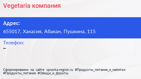 Vegetaria, компания по адресу 655017, Хакасия, Абакан, Пушкина, 115 в дальнейшем Организация, размещена в следующих категориях: