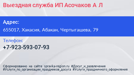 Выездная служба, ИП Асочаков А.Л. по адресу 655017, Хакасия, Абакан, Чертыгашева, 79 в дальнейшем Организация, размещена в следующих категориях: