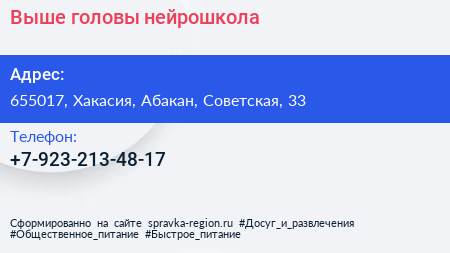 Выше головы, нейрошкола по адресу 655017, Хакасия, Абакан, Советская, 33 в дальнейшем Организация, размещена в следующих категориях: