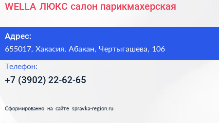 WELLA-ЛЮКС, салон-парикмахерская по адресу 655017, Хакасия, Абакан, Чертыгашева, 106 в дальнейшем Организация, размещена в следующих категориях: