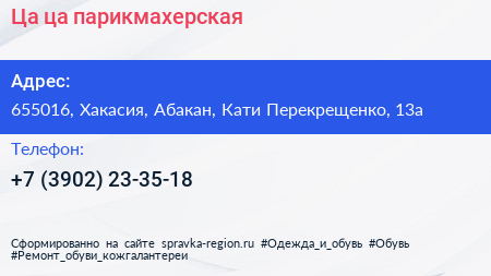 Ца-ца, парикмахерская по адресу 655016, Хакасия, Абакан, Кати Перекрещенко, 13а в дальнейшем Организация, размещена в следующих категориях: