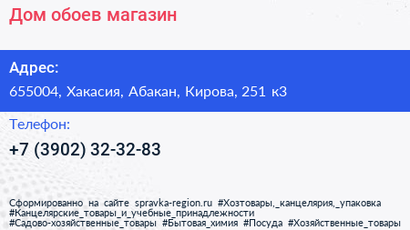 Дом обоев, магазин по адресу 655004, Хакасия, Абакан, Кирова, 251 к3 в дальнейшем Организация, размещена в следующих категориях: