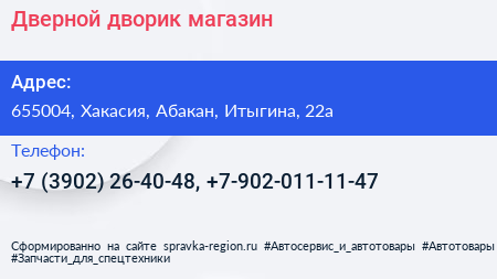 Дверной дворик, магазин по адресу 655004, Хакасия, Абакан, Итыгина, 22а в дальнейшем Организация, размещена в следующих категориях: