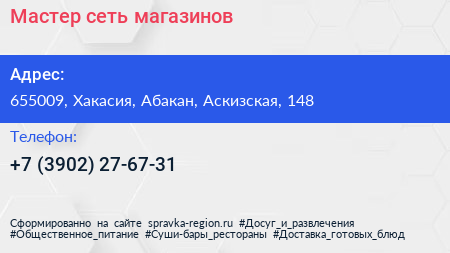 Мастер, сеть магазинов по адресу 655009, Хакасия, Абакан, Аскизская, 148 в дальнейшем Организация, размещена в следующих категориях: