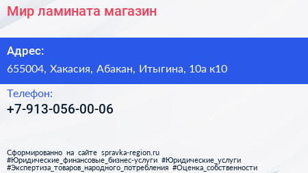 Мир ламината, магазин по адресу 655004, Хакасия, Абакан, Итыгина, 10а к10 в дальнейшем Организация, размещена в следующих категориях: