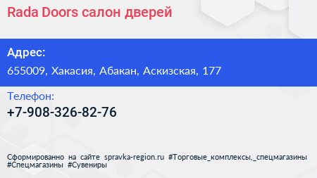 Rada Doors, салон дверей по адресу 655009, Хакасия, Абакан, Аскизская, 177 в дальнейшем Организация, размещена в следующих категориях: