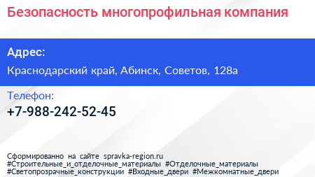 Безопасность, многопрофильная компания по адресу Краснодарский край, Абинск, Советов, 128а в дальнейшем Организация, размещена в следующих категориях: