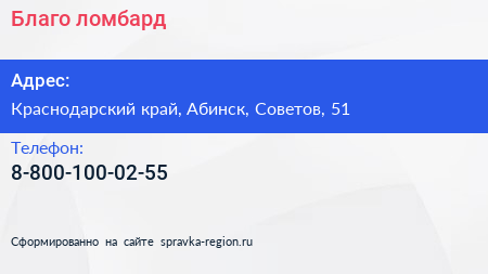 Благо, ломбард по адресу Краснодарский край, Абинск, Советов, 51 в дальнейшем Организация, размещена в следующих категориях: