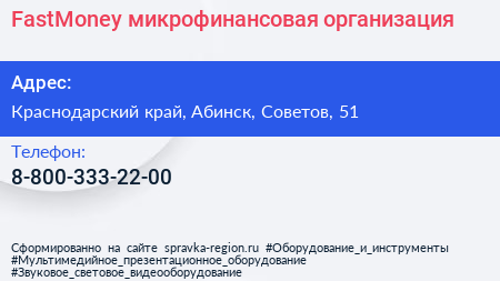 FastMoney, микрофинансовая организация по адресу Краснодарский край, Абинск, Советов, 51 в дальнейшем Организация, размещена в следующих категориях: