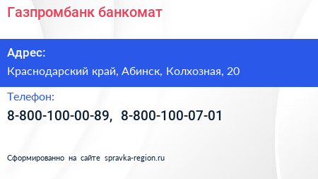 Газпромбанк, банкомат по адресу Краснодарский край, Абинск, Колхозная, 20 в дальнейшем Организация, размещена в следующих категориях: