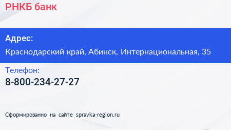 РНКБ, банк по адресу Краснодарский край, Абинск, Интернациональная, 35 в дальнейшем Организация, размещена в следующих категориях: