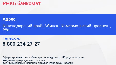 РНКБ, банкомат по адресу Краснодарский край, Абинск, Комсомольский проспект, 99а в дальнейшем Организация, размещена в следующих категориях: