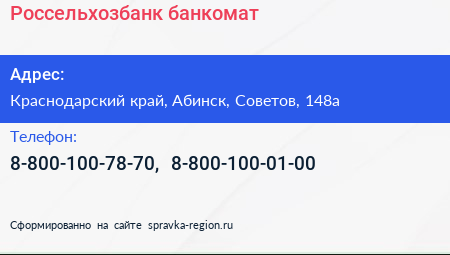 Россельхозбанк, банкомат по адресу Краснодарский край, Абинск, Советов, 148а в дальнейшем Организация, размещена в следующих категориях: