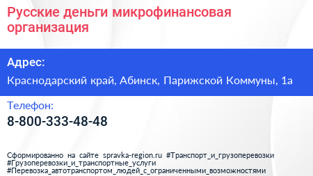 Русские деньги, микрофинансовая организация по адресу Краснодарский край, Абинск, Парижской Коммуны, 1а в дальнейшем Организация, размещена в следующих категориях:
