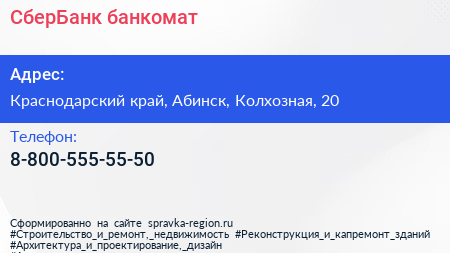 СберБанк, банкомат по адресу Краснодарский край, Абинск, Колхозная, 20 в дальнейшем Организация, размещена в следующих категориях: