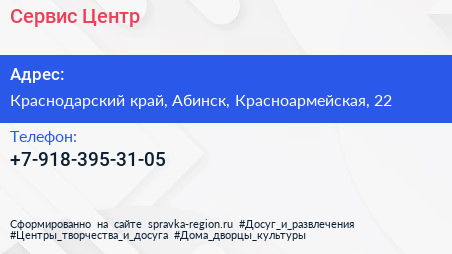 Сервис-Центр по адресу Краснодарский край, Абинск, Красноармейская, 22 в дальнейшем Организация, размещена в следующих категориях: