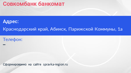 Совкомбанк, банкомат по адресу Краснодарский край, Абинск, Парижской Коммуны, 1а в дальнейшем Организация, размещена в следующих категориях:
