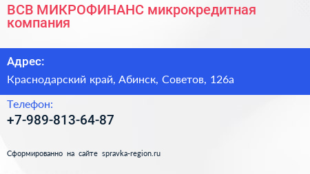 ВСВ-МИКРОФИНАНС, микрокредитная компания по адресу Краснодарский край, Абинск, Советов, 126а в дальнейшем Организация, размещена в следующих категориях: