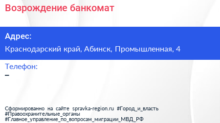 Возрождение, банкомат по адресу Краснодарский край, Абинск, Промышленная, 4 в дальнейшем Организация, размещена в следующих категориях: