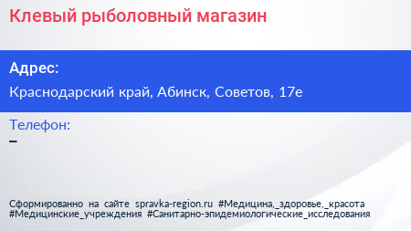 Клевый, рыболовный магазин по адресу Краснодарский край, Абинск, Советов, 17е в дальнейшем Организация, размещена в следующих категориях: