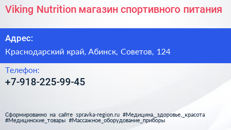 Viking Nutrition, магазин спортивного питания по адресу Краснодарский край, Абинск, Советов, 124 в дальнейшем Организация, размещена в следующих категориях: