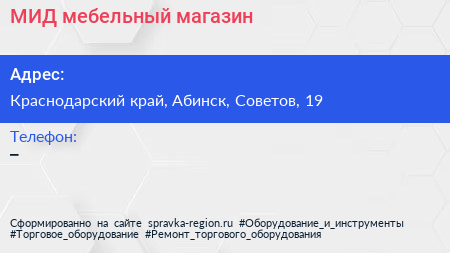 МИД, мебельный магазин по адресу Краснодарский край, Абинск, Советов, 19 в дальнейшем Организация, размещена в следующих категориях: