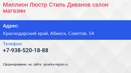 Миллион Люстр & Стиль Диванов, салон-магазин по адресу Краснодарский край, Абинск, Советов, 54 в дальнейшем Организация, размещена в следующих категориях: