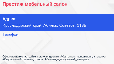 Престиж, мебельный салон по адресу Краснодарский край, Абинск, Советов, 118Б в дальнейшем Организация, размещена в следующих категориях: