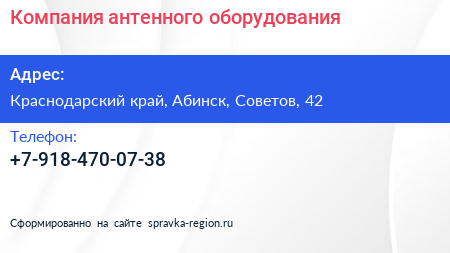 Компания антенного оборудования по адресу Краснодарский край, Абинск, Советов, 42 в дальнейшем Организация, размещена в следующих категориях: