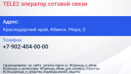 TELE2, оператор сотовой связи по адресу Краснодарский край, Абинск, Мира, 2 в дальнейшем Организация, размещена в следующих категориях: