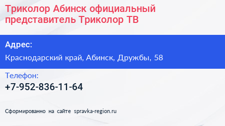 Триколор Абинск, официальный представитель Триколор ТВ по адресу Краснодарский край, Абинск, Дружбы, 58 в дальнейшем Организация, размещена в следующих категориях: